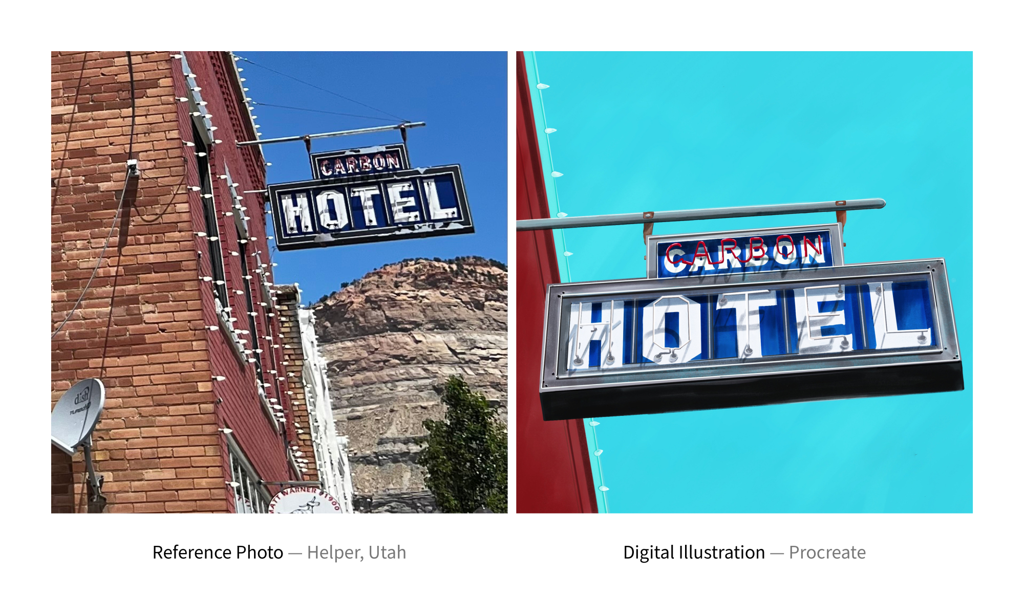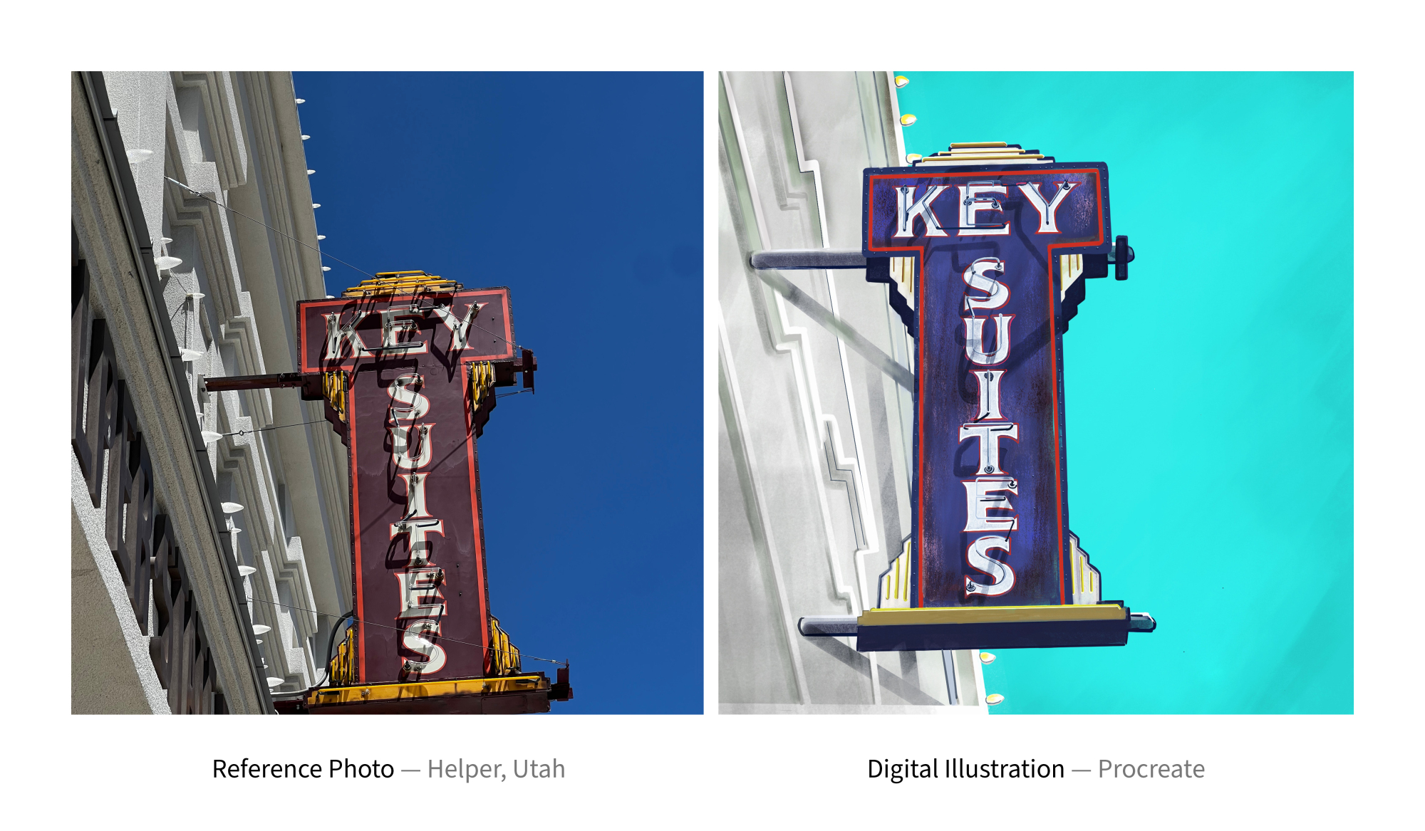 This digital illustration series captures the charm of Helper, Utah — a small town known for its beautifully restored vintage signage along Main Street. Each piece was drawn in the Procreate app on the iPad, inspired by the bold colors, retro letterforms, and nostalgic character of these historic signs. Carbon Hotel and Key Suites are the first two in the series, with more to come as the collection grows.